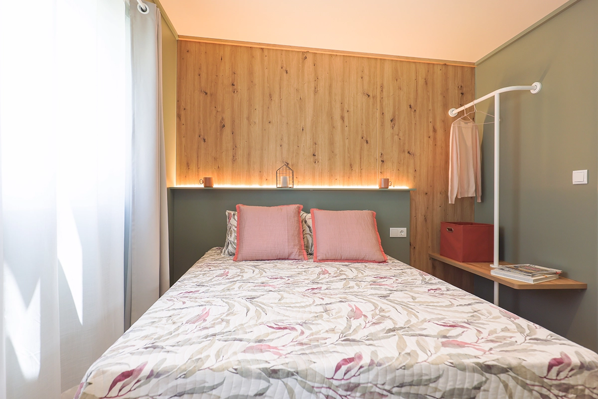 | Interruptores conmutados, balda de apoyo, enchufes y focos de lectura en cabecero |