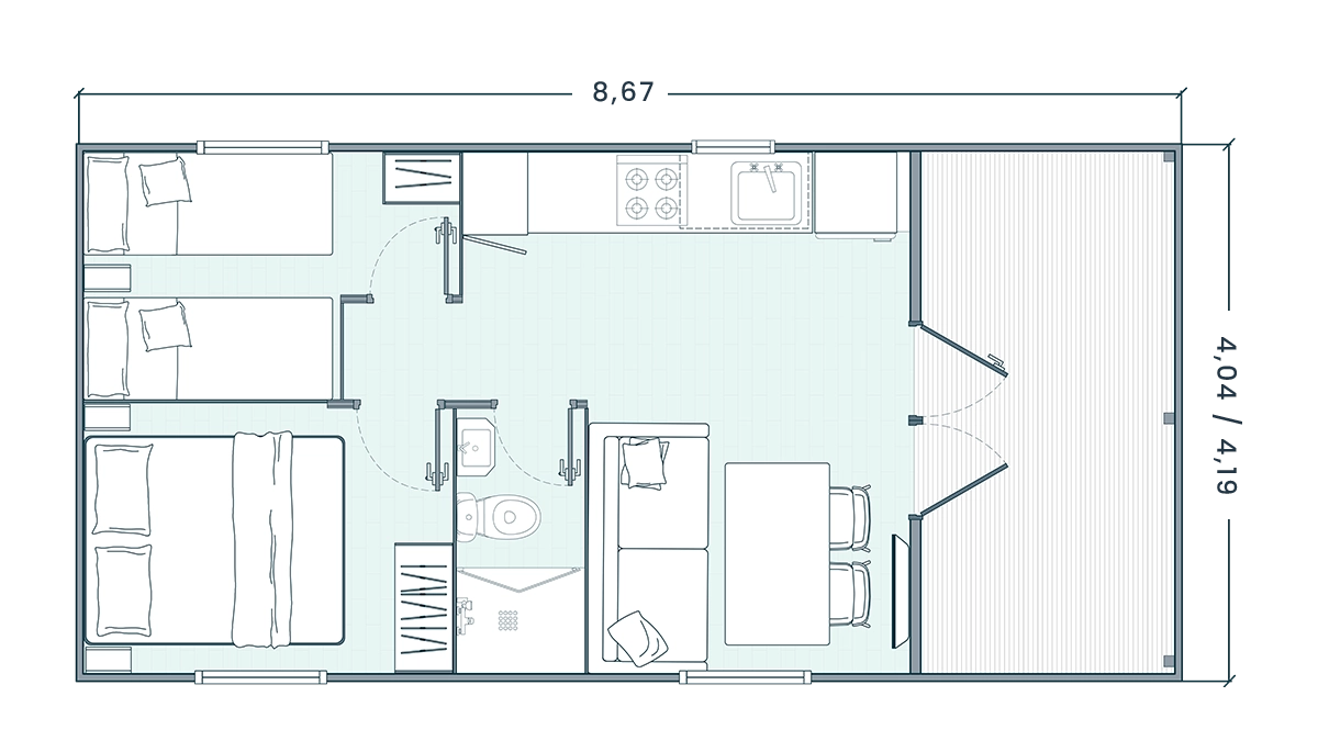 Nuestra línea de mobil homes Bora Bora evocan una sensación de paraíso y belleza natural creando ambientes mágicos y ofreciendo la máxima comodidad en cada rincón.