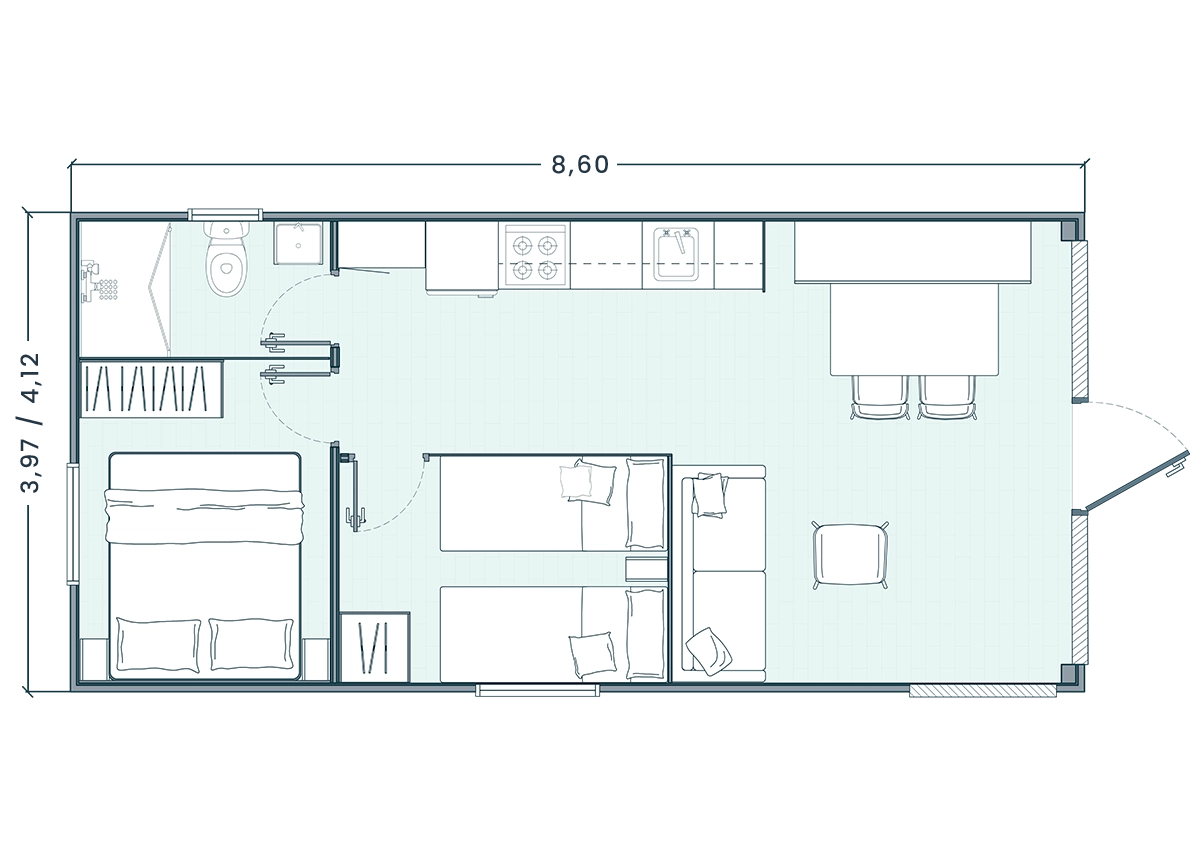 MIAMI BEACH 863 es una mobil home con 2 habitaciones y salón cocina en L con amplios ventanales que fusionan el interior con el exterior.